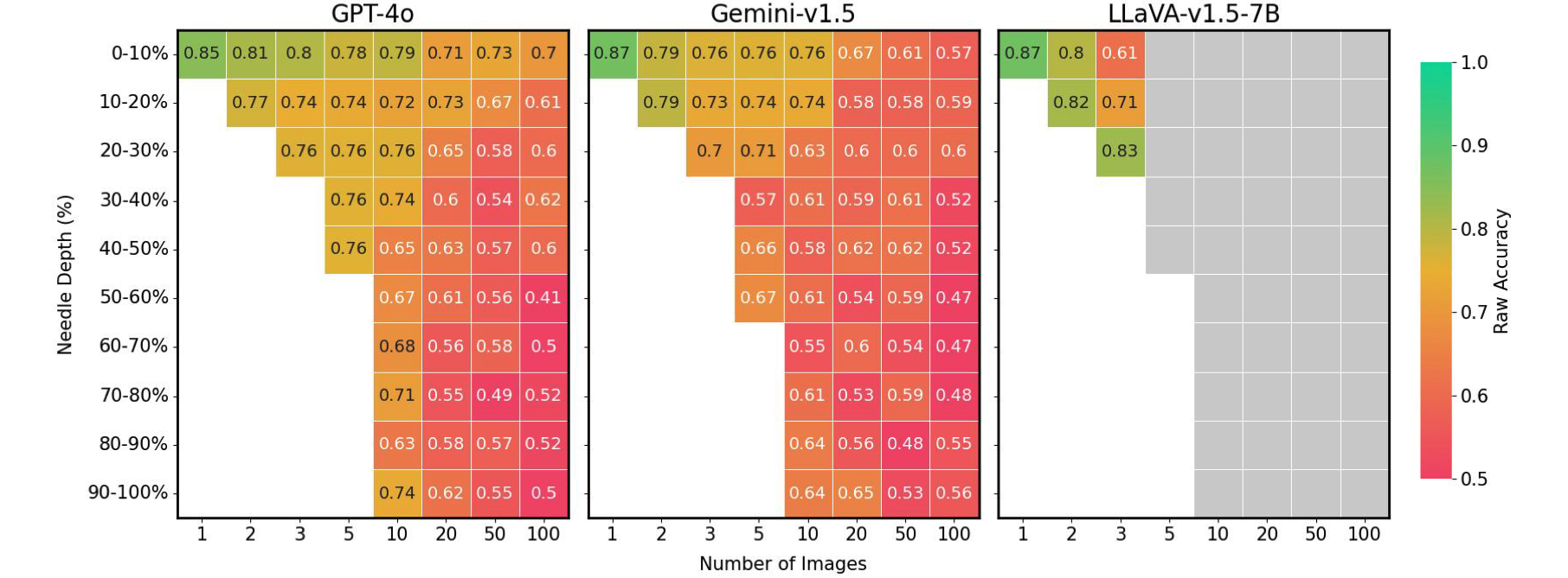 Needle position vs. performance on VHs for various image settings. Existing LMMs show up to 41% performance drop when the needle is not ideally placed. Gray boxes: Exceeds context length.