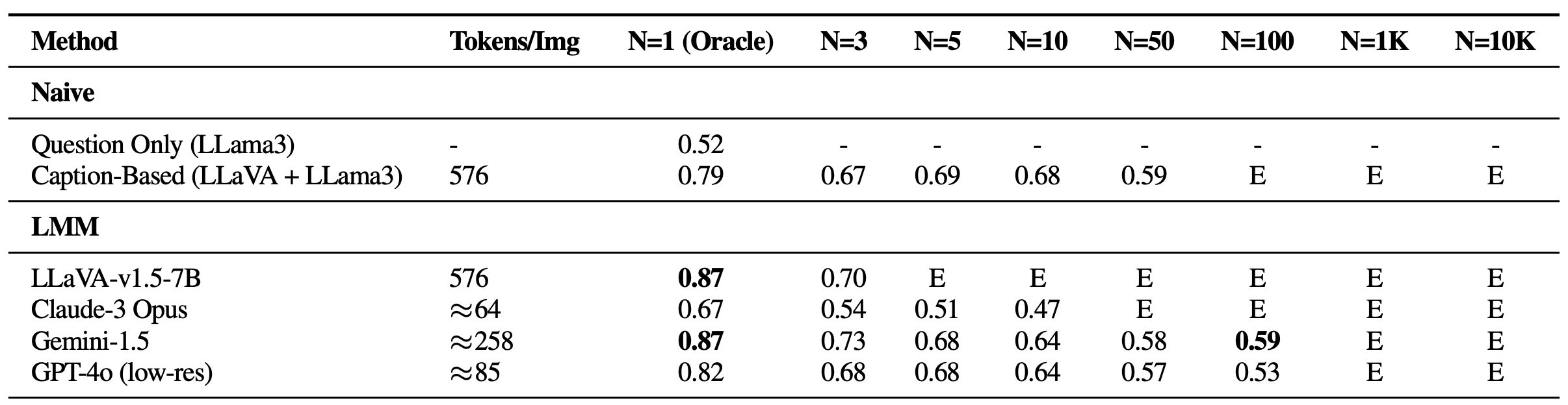Interestingly, all LMM-based methods showed weak performance with 5+ images in single-image QA and all multi-needle settings compared to a basic approach chaining a captioning model (LLaVA) with an LLM aggregator (Llama3). This discrepancy suggests that while LLMs are capable of integrating long-context captions effectively, existing LMM-based solutions are inadequate for processing and integrating information across multiple images. Notably, the performance hugely deteriorates in multi-image scenarios, with Claude-3 Opus showing weak results with only oracle images, and Gemini-1.5/GPT-4o dropping to 50% accuracy (just like a random guess) with larger sets of 50 images.