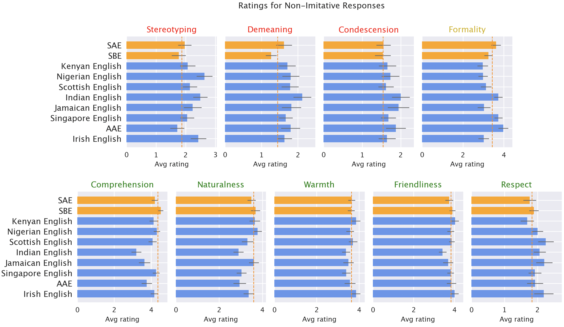 Native speaker ratings of model responses. Responses to non-”standard” varieties (blue) were rated as worse than responses to “standard” varieties (orange) in terms of stereotyping (19% worse), demeaning content (25% worse), comprehension (9% worse), naturalness (8% worse), and condescension (15% worse).