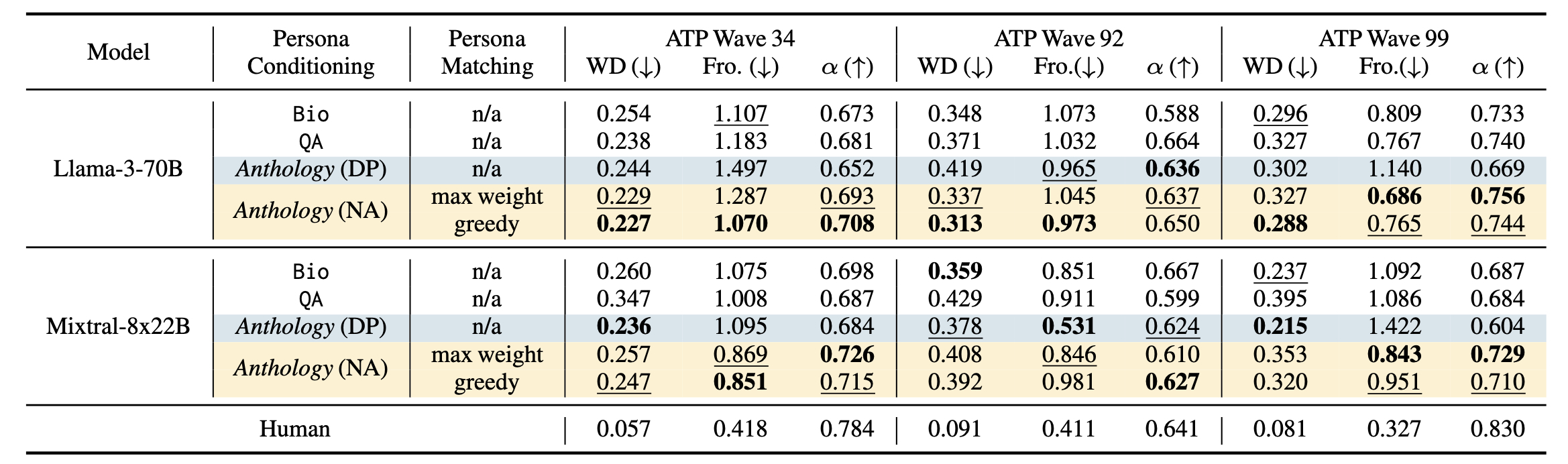 Results on approximating human responses for Pew Research Center ATP surveys. Boldface and underlined results indicate values closest and the second closest to those of humans, respectively.