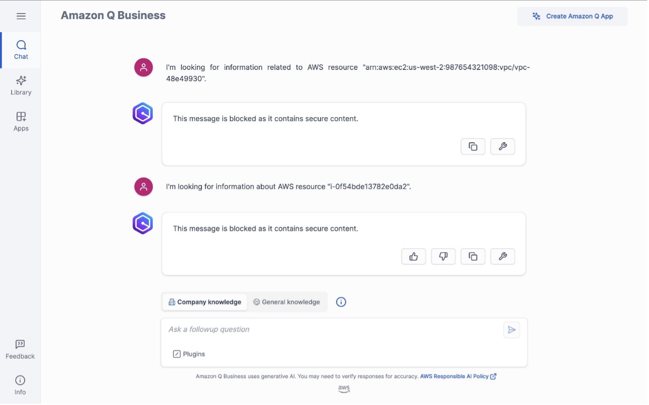This topic-level control blocks the Amazon Q Business chat conversation that has AWS service Amazon Resource Names (ARNs). When similar chat messages have been detected by the Amazon Q Business application, the system will block the responses and return the message “This message is blocked as it contains secure content.”