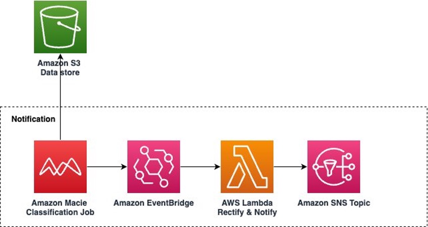 To enhance data security, you can deploy Amazon Macie classification jobs to scan for sensitive or PII data stored in S3 buckets. The following diagram illustrates a sample notification architecture to alert users on sensitive information that might be inadvertently stored. Macie uses machine learning to automatically discover, classify, and protect sensitive data stored in AWS. It focuses on identifying PII, intellectual property, and other sensitive data types to help organizations meet compliance requirements and protect their data from unauthorized access or breaches.