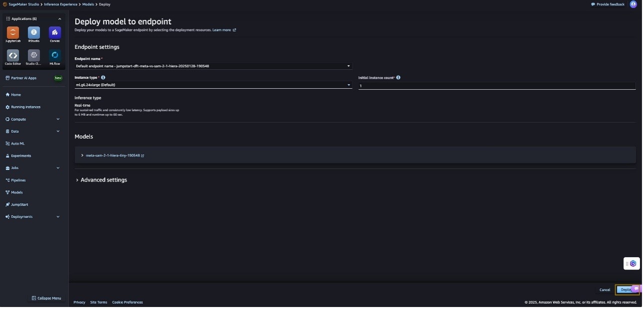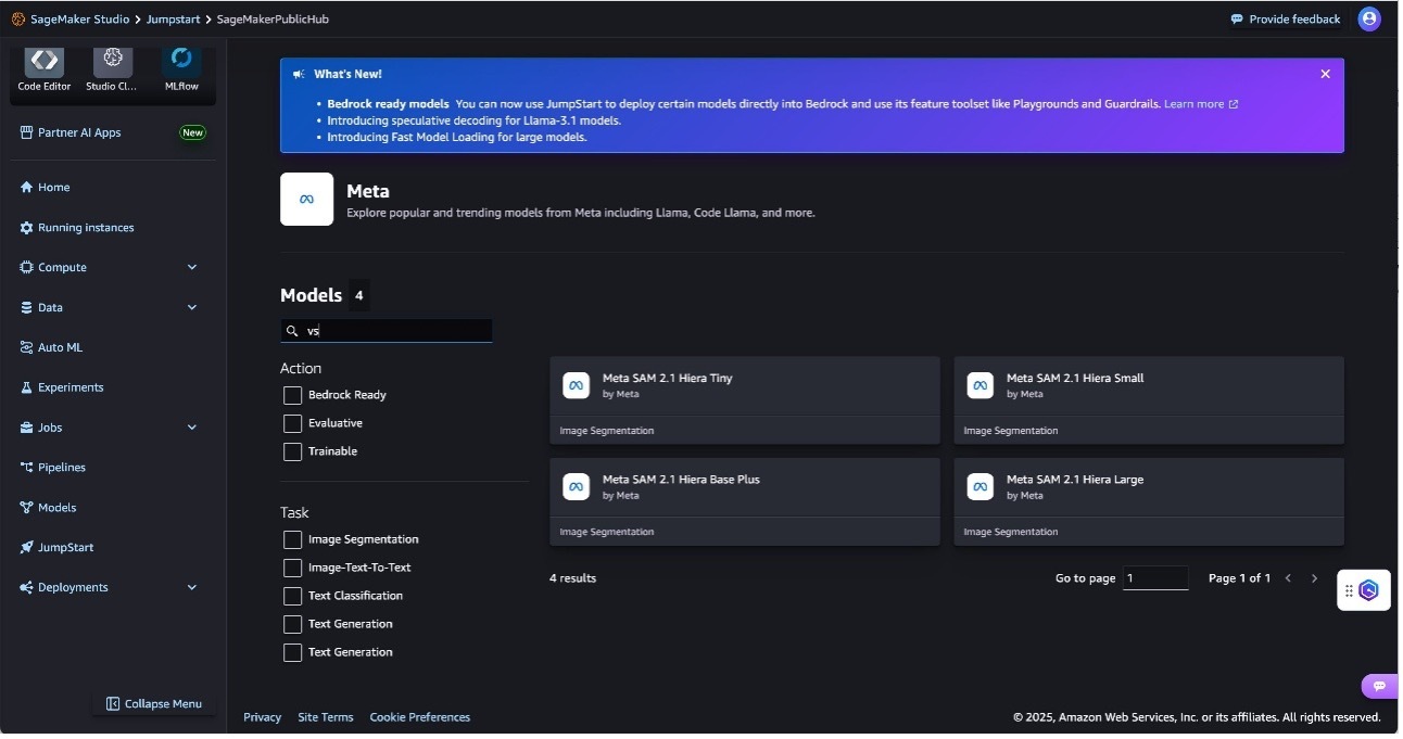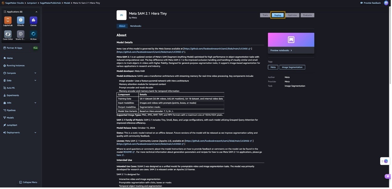 You can access the SageMaker JumpStart UI through either Amazon SageMaker Unified Studio or SageMaker Studio. To deploy Meta SAM 2.1 using the SageMaker JumpStart UI, complete the following steps: