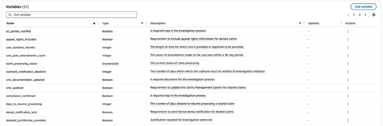 The following screenshots show an extract of the rules and variables created by the Automated Reasoning checks feature. The actual policy will have more rules and variables that can be viewed in Amazon Bedrock, but we’re not showing them here due to space limits.