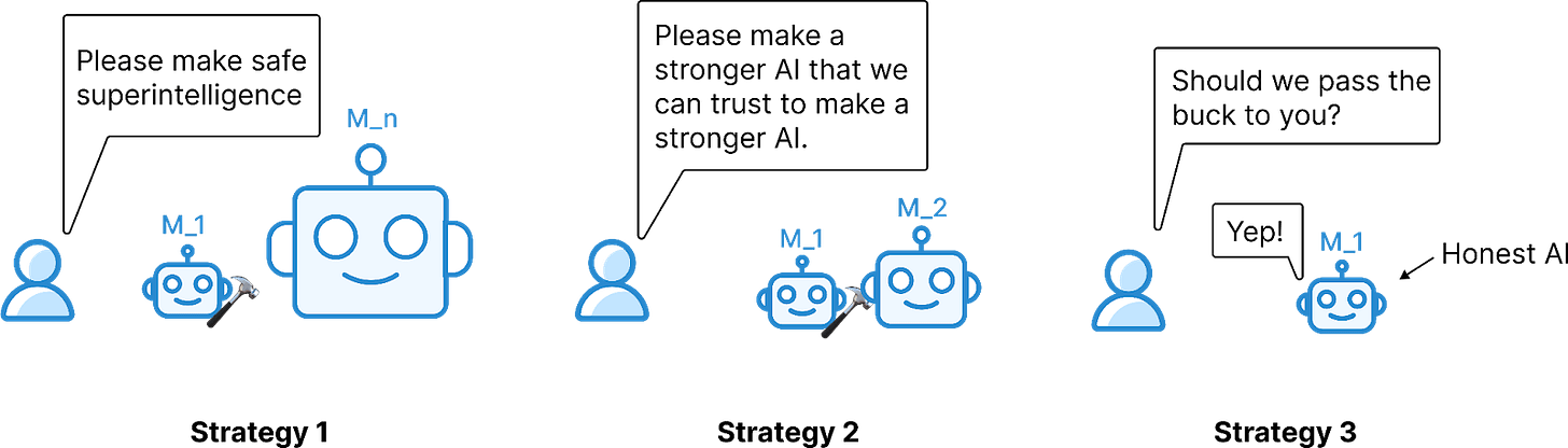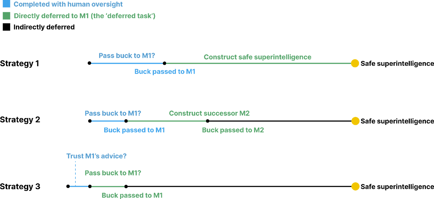 - Pass the buck. The developer trusts M_1 to autonomously complete some deferred task from the aforementioned strategies (e.g. ‘make a more capable successor M_2’).