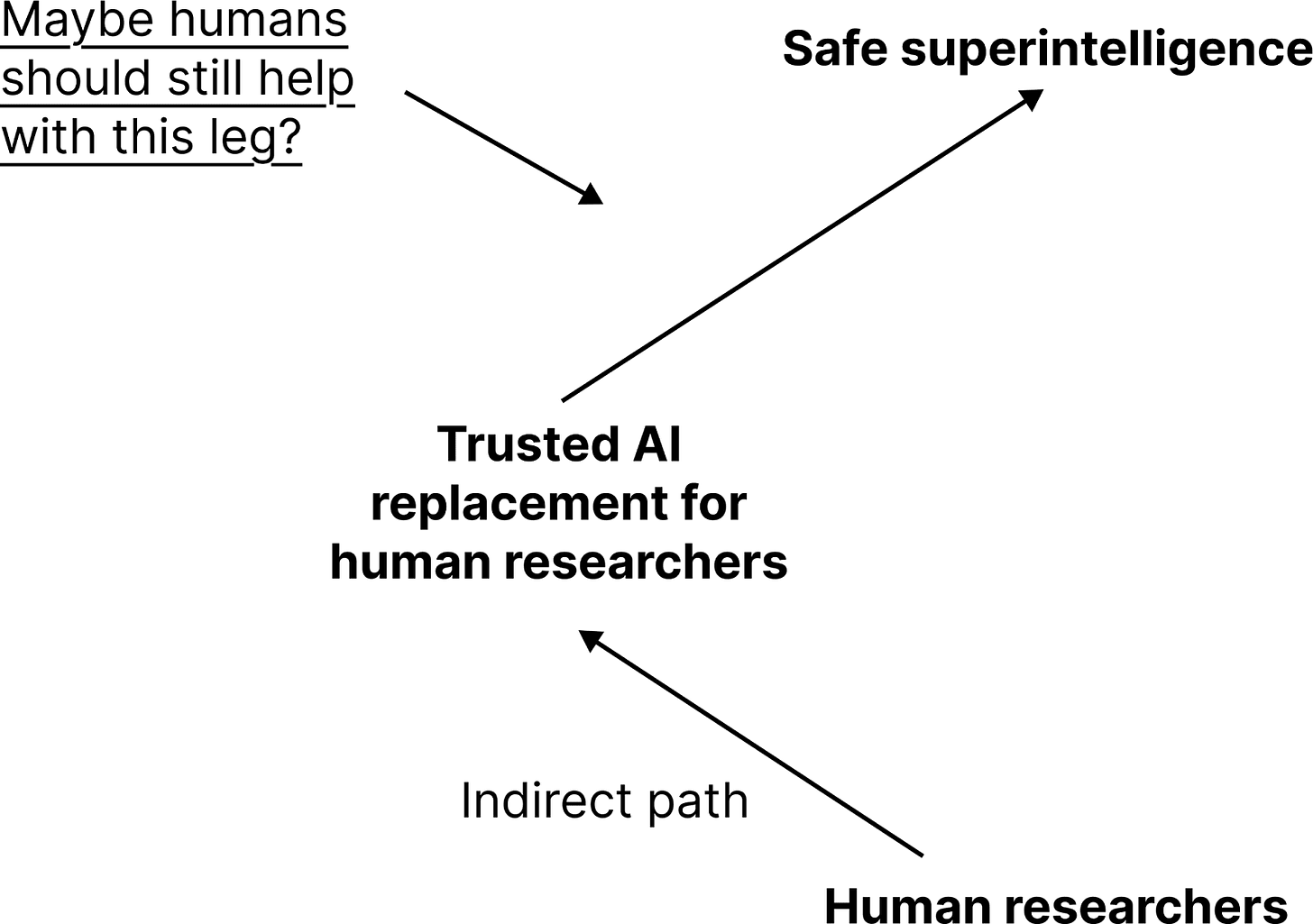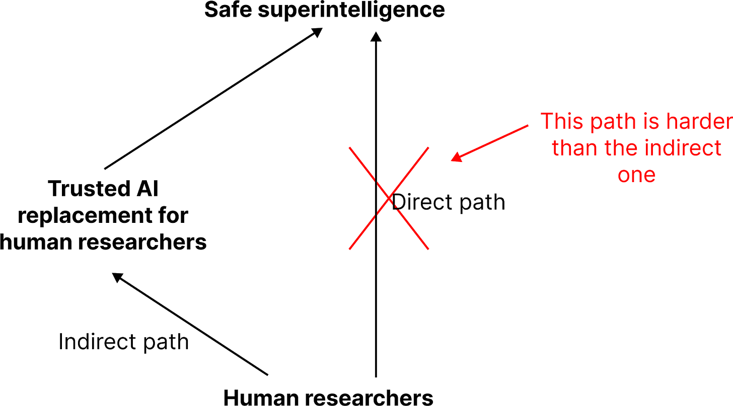 Figure 1. A summary of why I think human AI safety researchers should focus on safely replacing themselves with AI (“passing the buck”) instead of directly creating safe superintelligence.