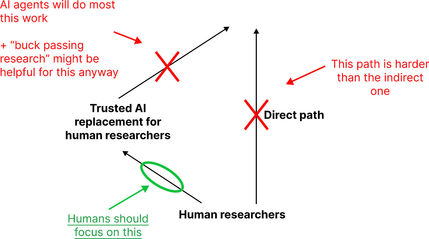 - AI agents might have very little time to scale safety to superhuman capabilities. So humans should spend most of their effort on scalable safety, rather than ‘passing the buck.’