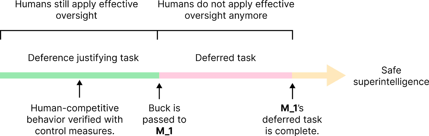 - Claim: A developer tasks an AI system N_1 to carry out a deference justifying task under human supervision. For example, N_1 performs research to determine whether AI developers should pass the buck to some other AI system M_1. Eventually, N_1 is quite confident that passing the buck to M_1 is a good idea OR that its assessment is unlikely to meaningfully change with additional labor.