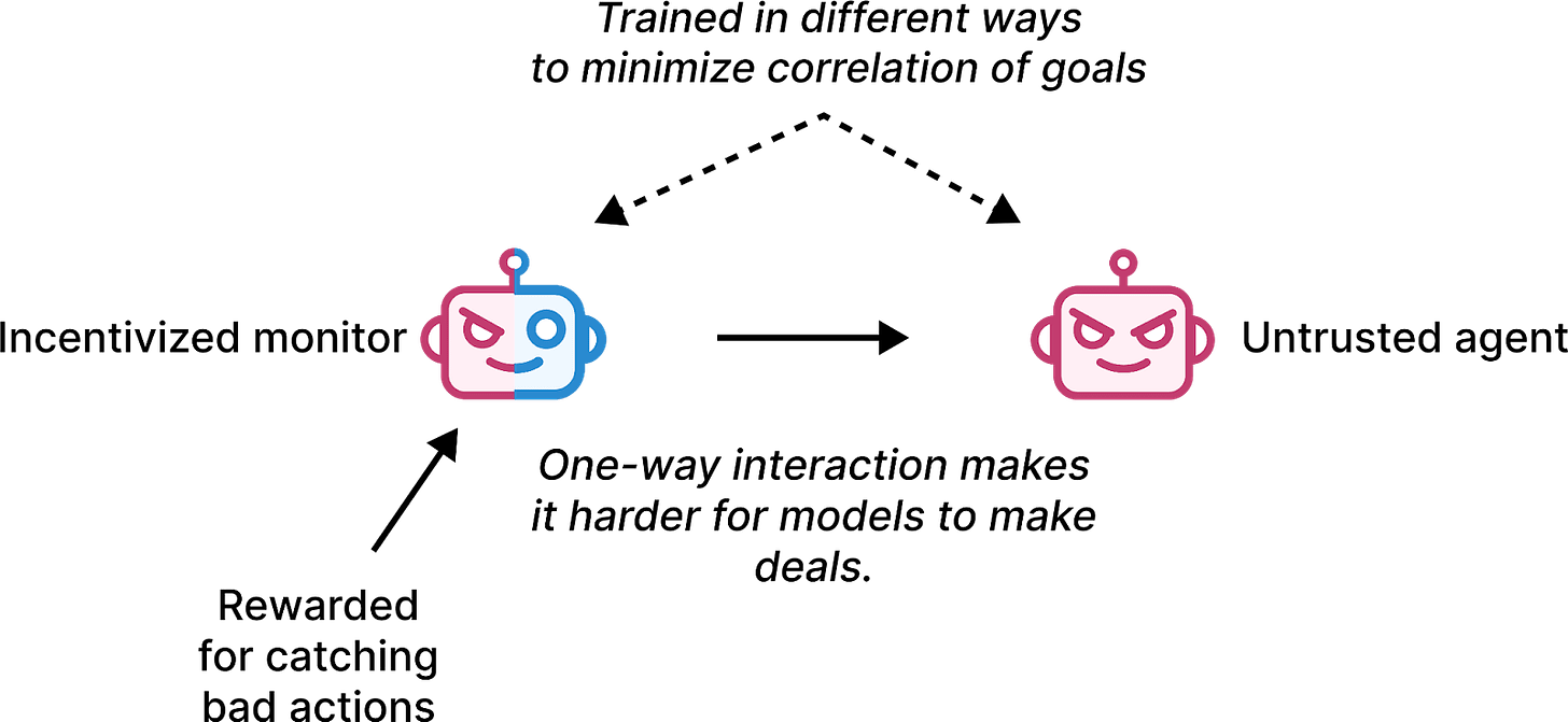 - AI agents are unable to make trades with each other. AI agents might have different goals and still make agreements with successors (perhaps verified with lie detectors). One way to prevent these agreements is to block communication between monitors and the agents they monitor. That way, monitors can never express what outcomes they care about.