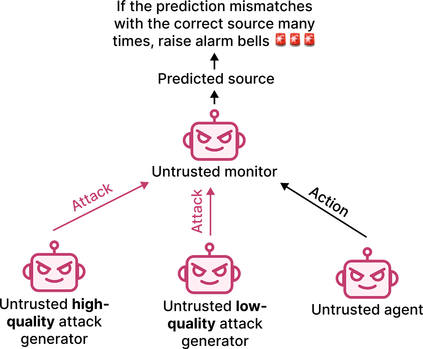 Figure 7. An autonomous control setup that maintains a multi-party-integrity property. Under particular conditions (section 9), if some models begin to misbehave but others don’t, alarms will go off. So models have to navigate a challenging coordination problem to defect silently.