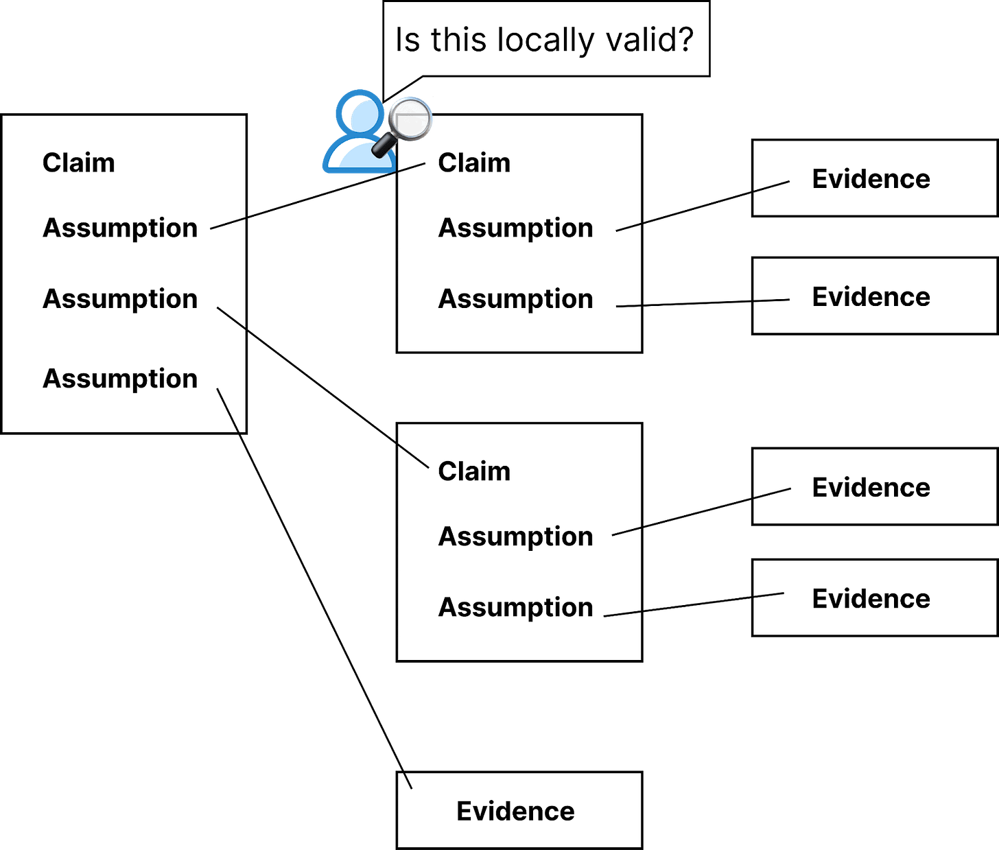Figure 9. The ‘read bits and pieces’ approach to verifying large research artifacts is only viable if these artifacts are locally verifiable. In the illustration above, developers structure research as a locally verifiable safety case, where every claim relies on clearly stated assumptions, which are also justified with locally verifiable artifacts.