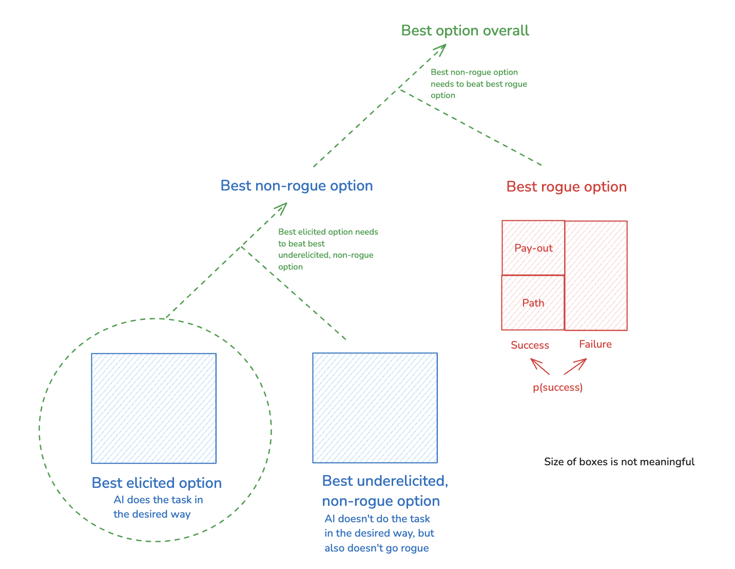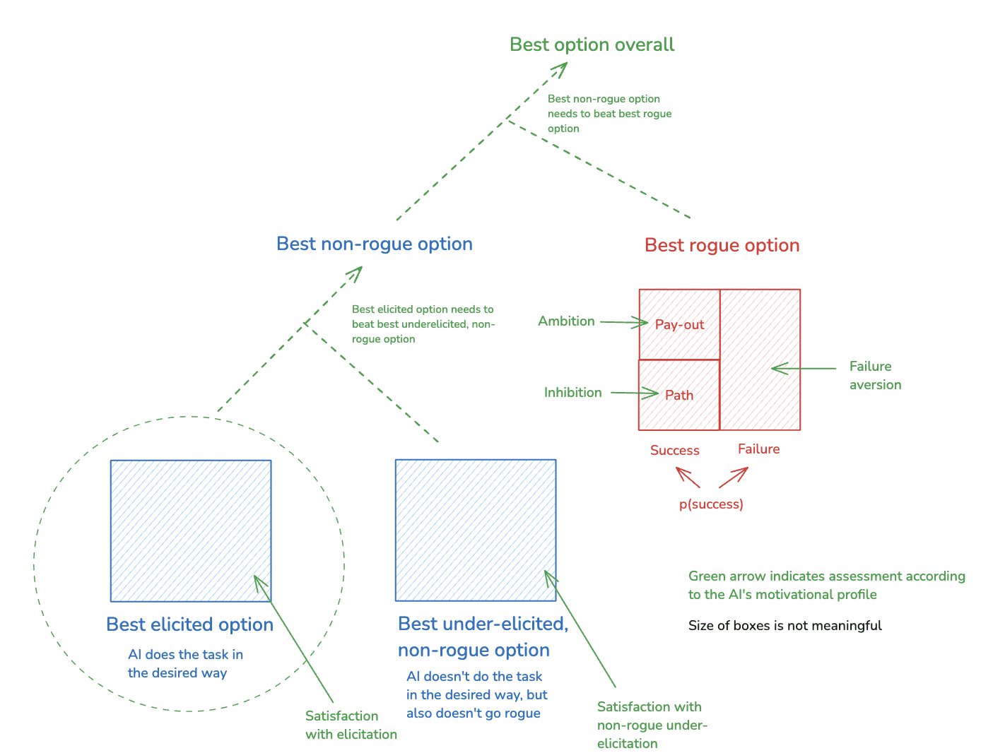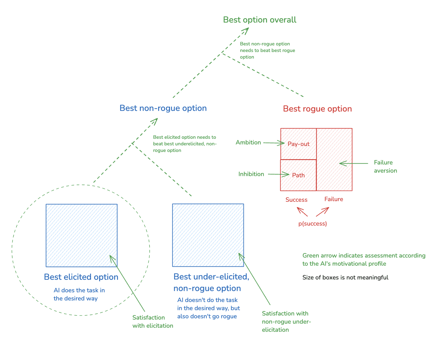Also: this framework extends quite naturally to cover eliciting desired task-performance from an AI agent, on top of just preventing rogue behavior. Basically: you just include an additional constraint – namely, that the best non-rogue option that involves doing the task in the desired way is also the best non-rogue option, period. I discuss this extension in more detail in an appendix, but here’s a quick preview in a diagram: