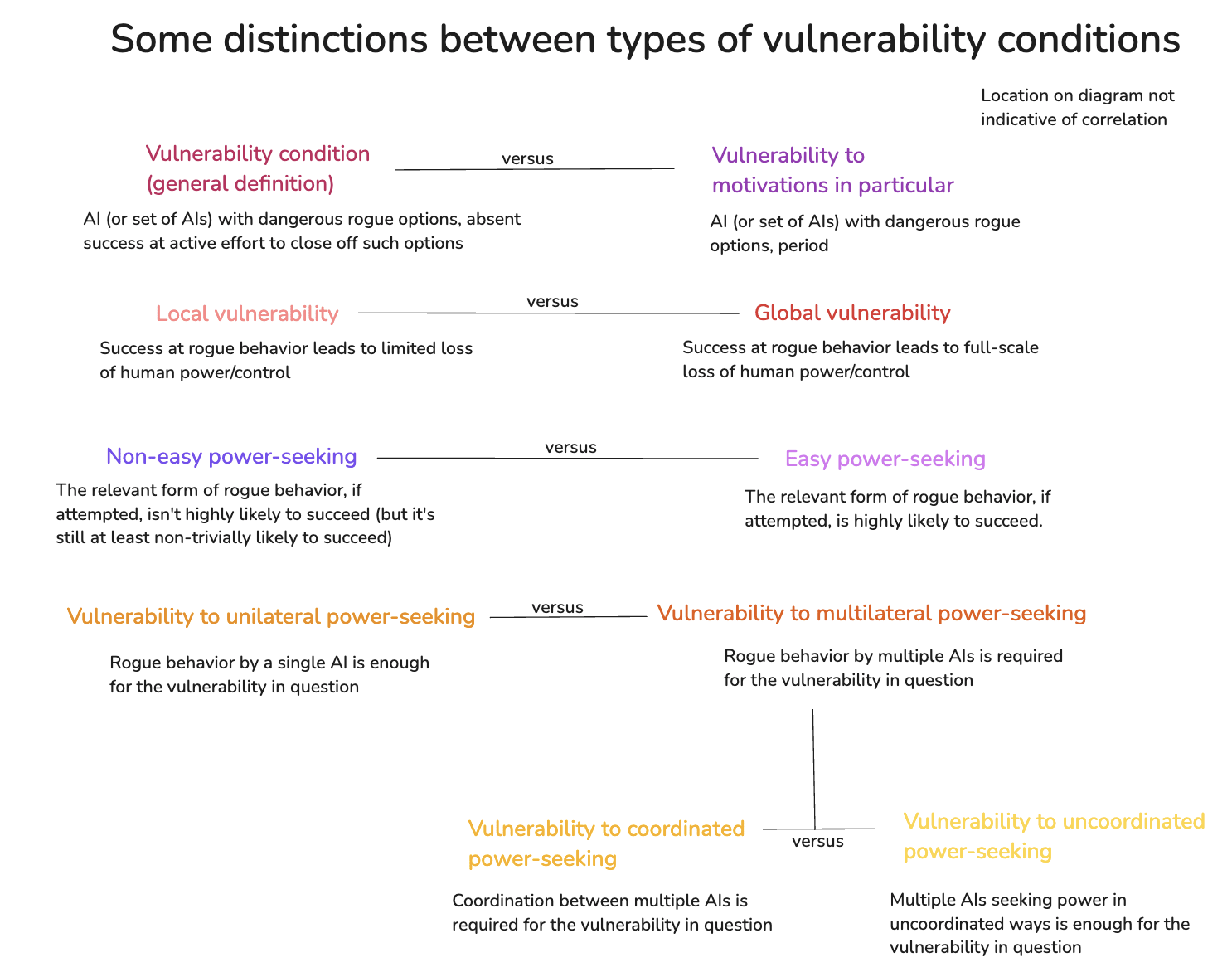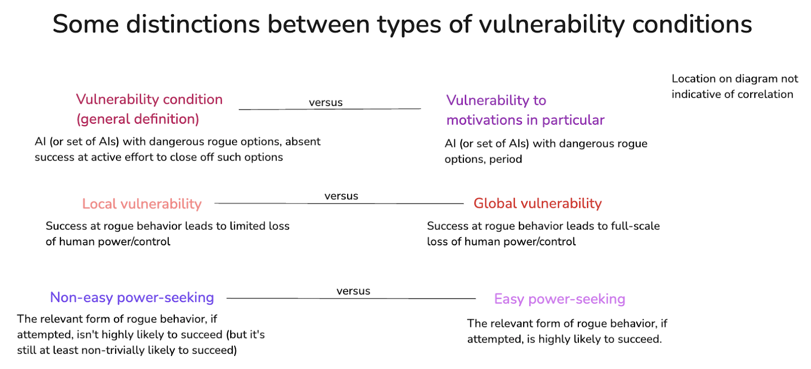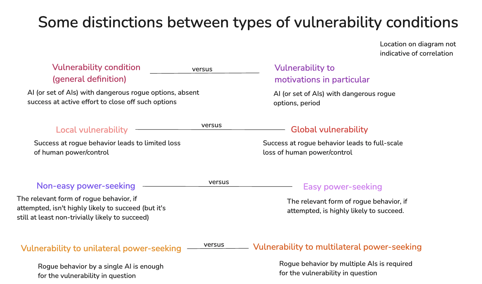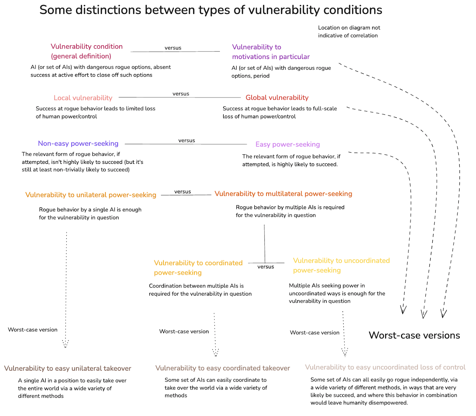 With these different kinds of vulnerability conditions in mind, we can also hone in on the most worrying versions. In particular: the scariest scenarios involve global vulnerability to an AI, or a set of AIs, being motivated to pursue easy forms of power-seeking. That is: in such cases, such AIs do have dangerous rogue options available, pursuing these options would very likely lead to these AIs getting more power, and if they choose to pursue such options, then humanity would be permanently disempowered. Adding these to the diagram:
