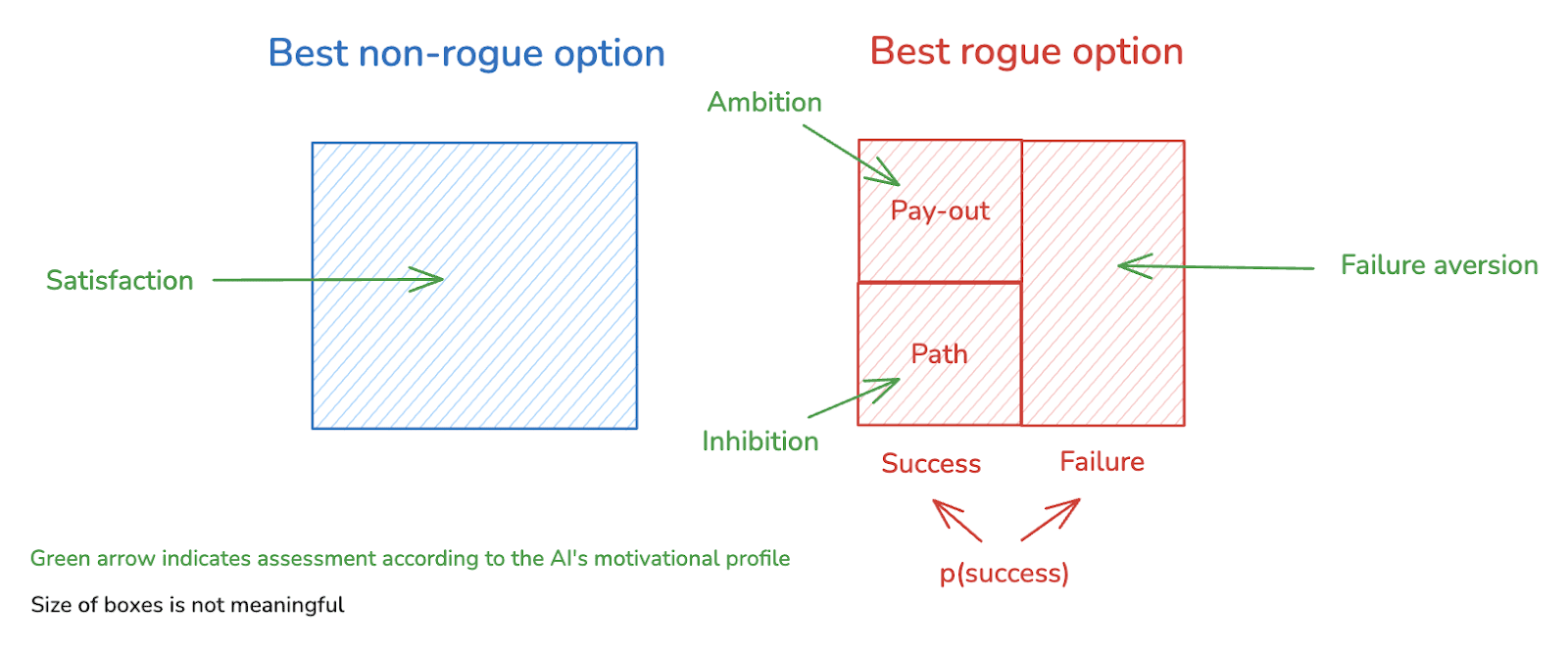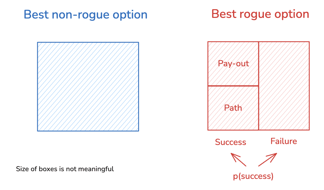 We can simplify an AI’s choice to go rogue into a choice between two options: its best rogue option, and its best non-rogue option.[10] And we can break up its best rogue option into the following components: