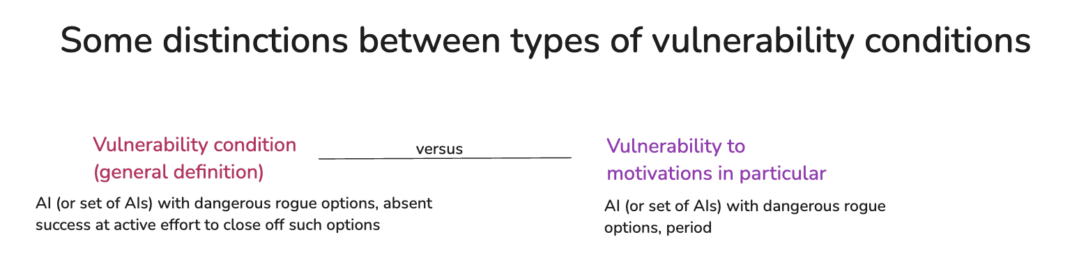 In principle, we could define vulnerability conditions as: conditions where you need to be engaged in both active option control and active motivation control in order to prevent rogue behavior. But I think it’s much more complicated to analyze whether we are in fact headed for these sorts of scenarios. And I think the idea that it’s up to the AIs whether or not to disempower humans should be enough to get us worried.
