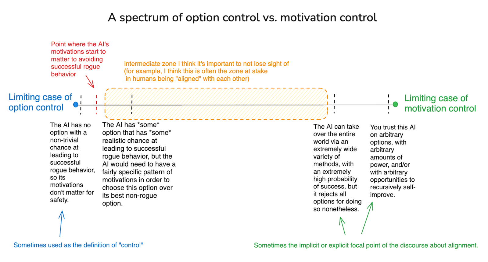 Here’s a rough diagram depicting a spectrum of “option control” and “motivation control,” according, roughly, to how much a given approach to safety leans on one vs. the other.